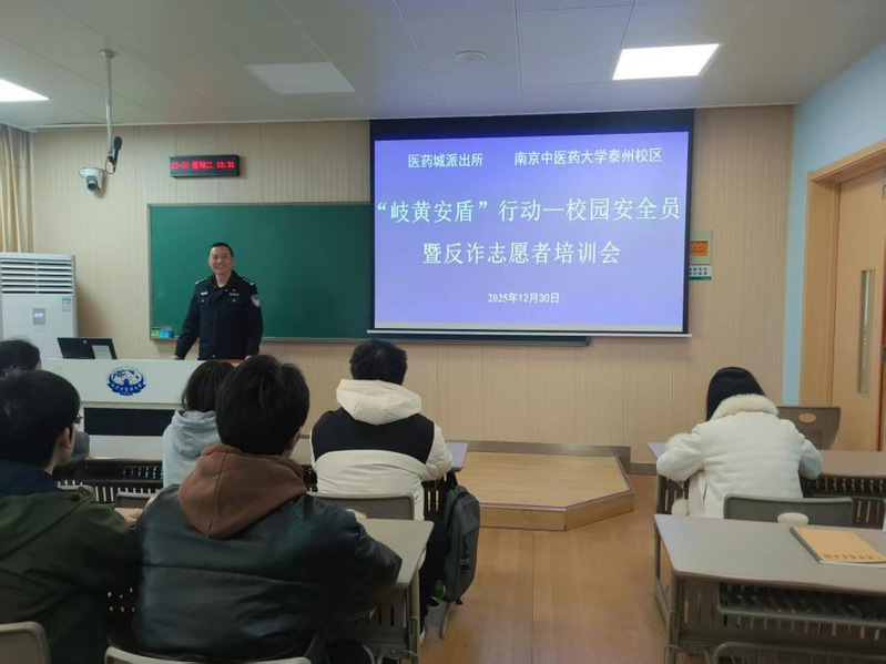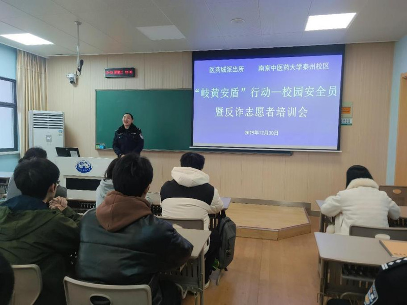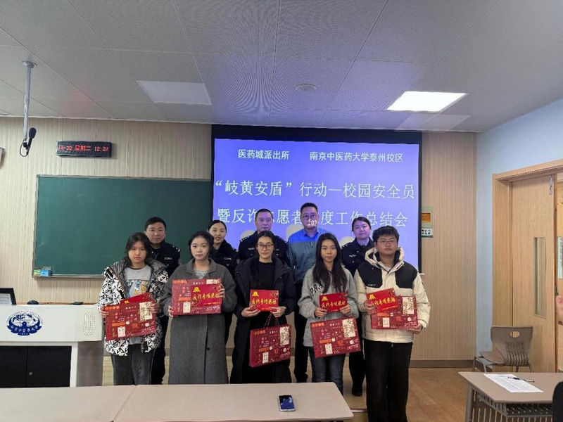 12月30日,医药城派出所与南京中医药大学泰州校区共同召开“岐黄安盾”行动—校园安全员暨反诈志愿者年度工作总结会。医药城派出所所长卢俊驰、教导员王露、驻校民警陆向峰,泰州校区保卫事务部老师及校园安全员参会。