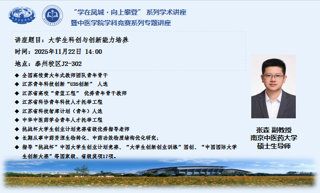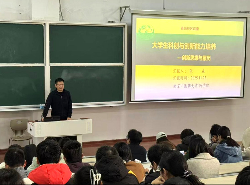 11月22日,泰州校区举办了“学在凤城·向上攀登”系列学术讲座之《大学生科创与创新能力培养》专题讲座。此次活动由泰州校区管理办公室联合中医学院、第一临床医学院共同举办,特别邀请张森副教授作为主讲嘉宾,在泰的中医学院、第一临床医学院学生积极参与其中。
