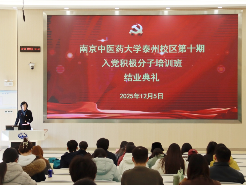2025年12月5日中午,南京中医药大学泰州校区第十期入党积极分子培训班结业典礼在J2-102教室隆重举行。泰州校区学生事务主任兼团工委书记王松云、党总支组织员移敏出席典礼,本期培训班全体入党积极分子学员及班主任参加,典礼由泰州校区分党校加瑞芳老师主持。