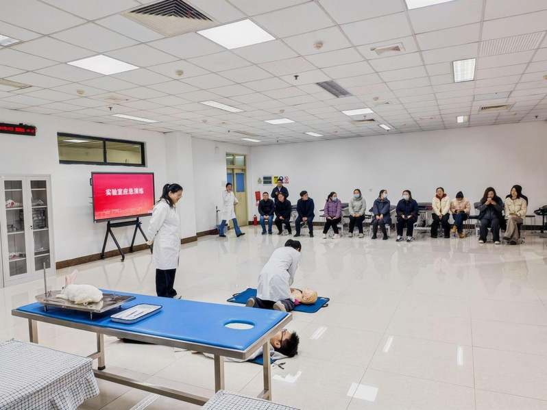 随后,实验室应急处置小组赶到现场,按应急处置流程对“患者”应急心肺复苏处置。经过数分钟紧张而规范的急救操作,“患者”逐渐恢复自主呼吸和心跳,意识开始清醒。医护人员随即对其进行进一步的生命体征监测和后续医疗处理,并将“患者”安全转运至医院进行观察治疗。整个演练过程紧张有序,参演人员反应迅速、分工明确、操作规范,充分展示了我校师生在突发事件中的应急响应能力和协同处置能力。